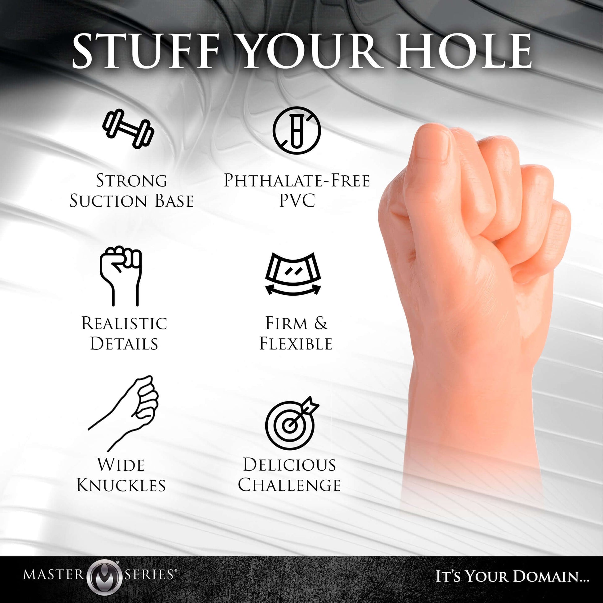 Take your best shot at going elbow deep on this extreme dildo! This smooth, lifelike fist and forearm allows you to master the next level of large insertions. Get all the length and girth your hole craves! You can fist yourself or get fisted by a partner with this clenched hand and the long arm that supports it. The realistic details will stretch you open and massage your hole. Perfect for vaginal or anal use, just lube up and get ready for intense penetrating pleasure. The flared base allows you to impale yourself entirely and ensures easy retrieval. The powerful suction cup can be mounted so that you can ride these knuckles... hands-free! Made of a phthalate-free material, it is body-safe and compatible with silicone and water-based lubricants. Clean with a mild soap or toy cleaner after use.