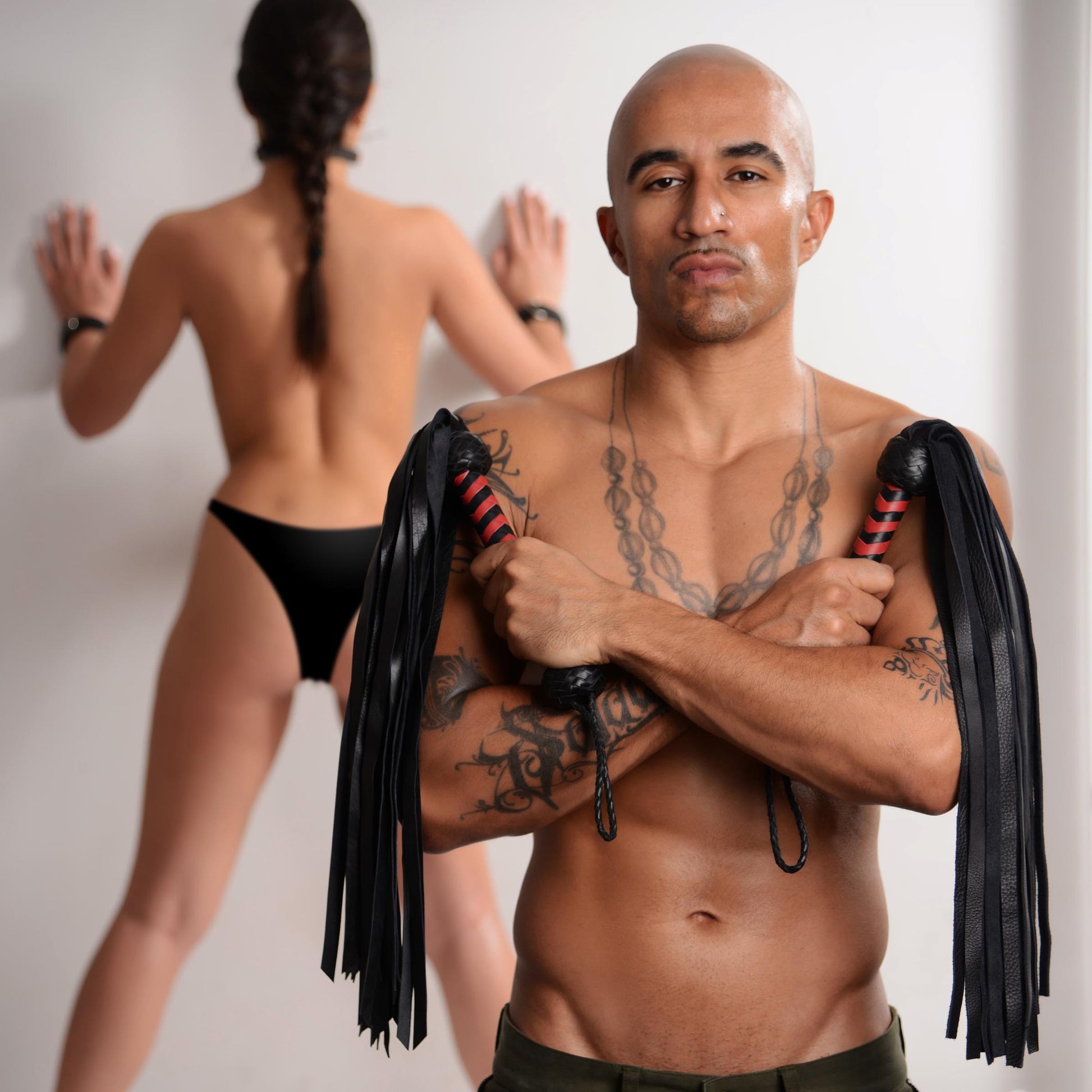 This heavy flogger offers a weighty thud upon impact. The bull hide leather is deeply grained, with a weighty feel. The handle has an attractive red and black herringbone pattern, tightly plaited and expertly designed. Each of the falls has a flat, squared tip for a unique feel. This quality toy is one of our staff favorites, and sure to please.