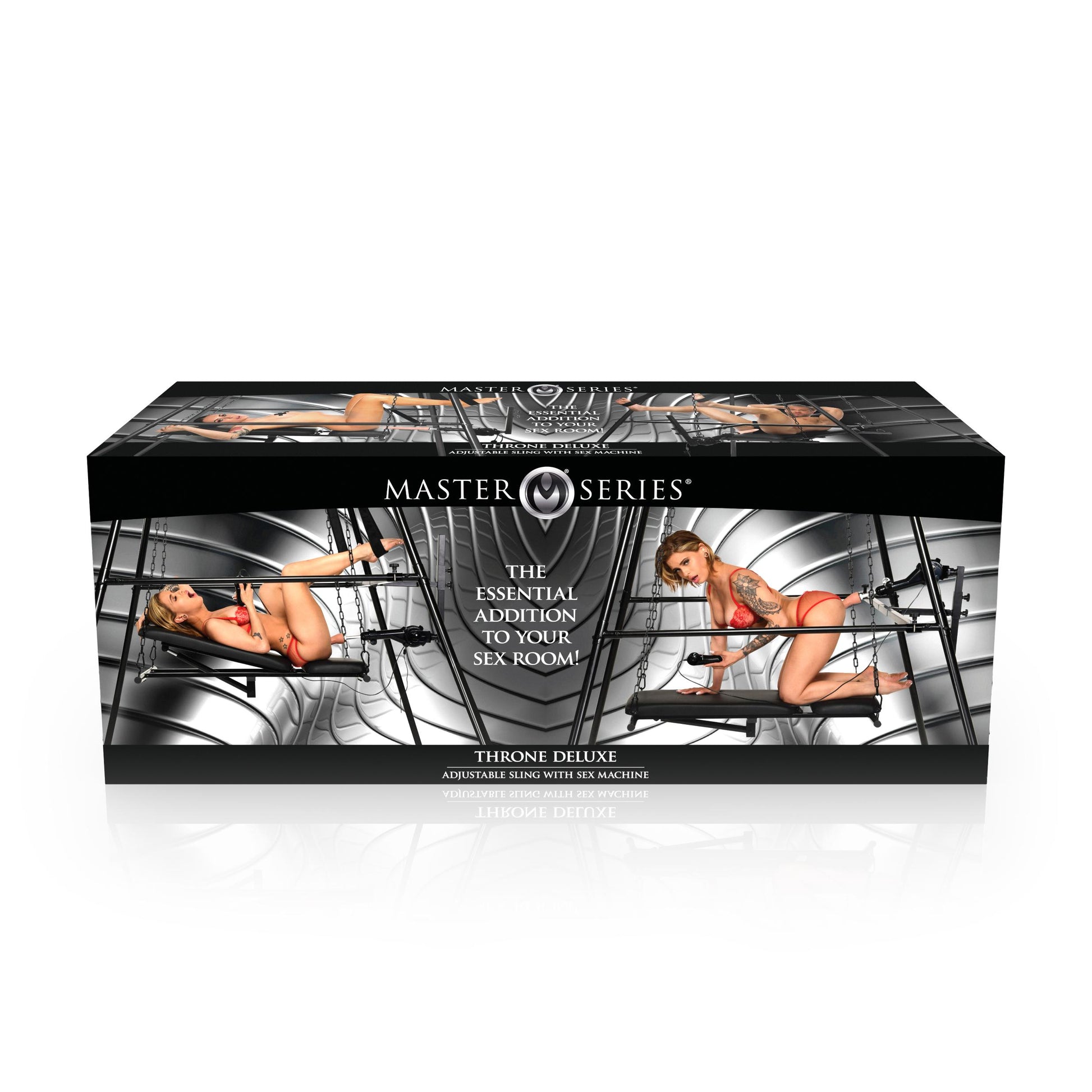 Craft a world that caters to all of your most elaborate fantasies! Unleash your desires with our cutting-edge Throne Deluxe, an adjustable sling with a detachable sex machine that's designed to maximize pleasure, encourage indulgence, all while remaining comfortable and ergonomic. The standout feature is a sturdy stand that supports a flat, cushioned board suspended by chains. The board can be lifted up for back support or reclined flat so you can enjoy it like a floating bed. Adjust the height of the board for your partner to easily have access to you and hang your feet up with the adjustable stirrups. Or enjoy the heathen's delight and go solo when you connect the machine to the bars of the frame and aim it to whichever hole needs filling! The detachable sex machine is designed to align with your unique preferences, allowing you to be pleasured from any angle. Including a premium silicone dildo and a Vac-U-Loc adapter, this setup guarantees adaptability that lets you use the dildo provided or one of your own. Made from stainless steel, it confidently supports up to 330 lbs. Transform your bedroom into a playground of passion and exploration. Whether you crave passionate couple’s play or intense solo sessions, this setup ensures your needs are met.